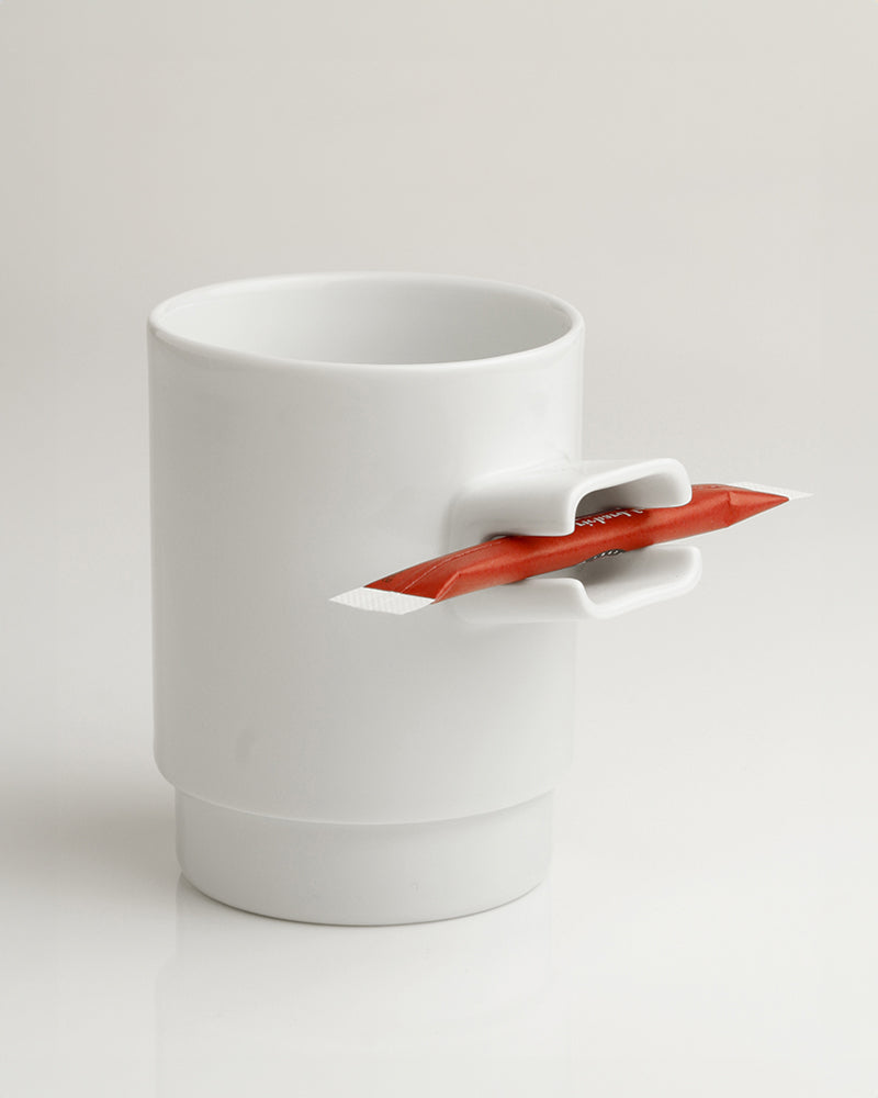 With sugar bag (sachet) est un mug pour le thé ou le café équipé d’une poignée avec un emplacement pour y déposer un morceau ou un sachet de sucre.